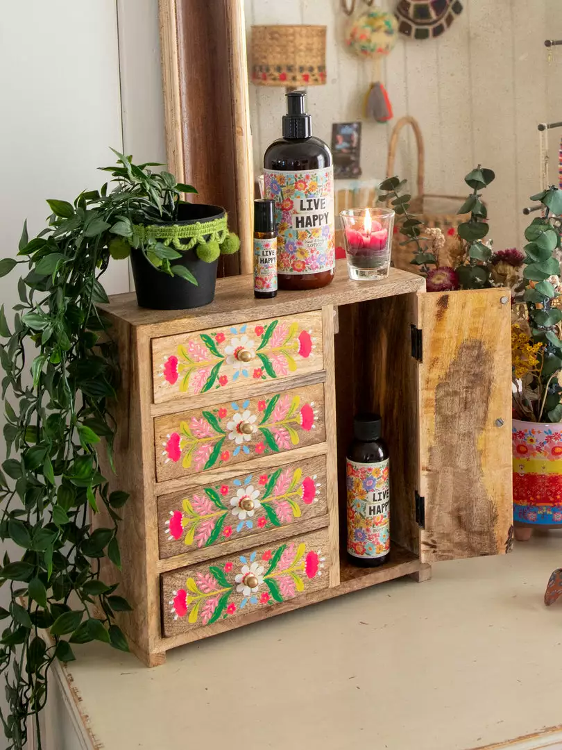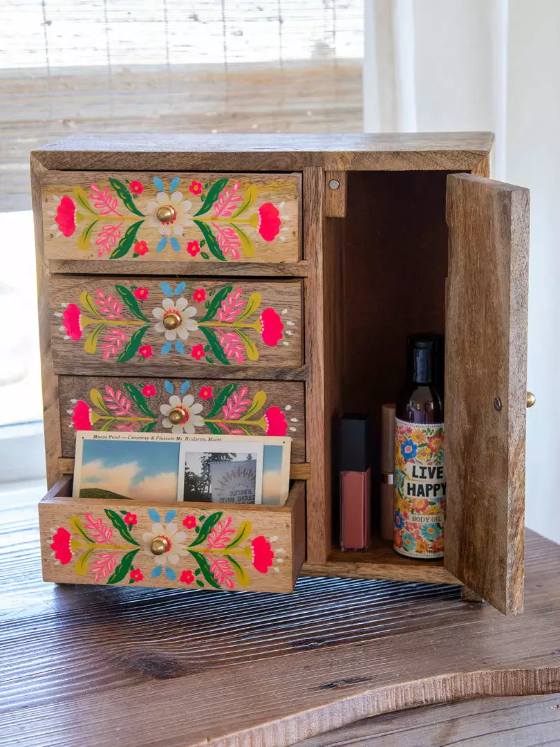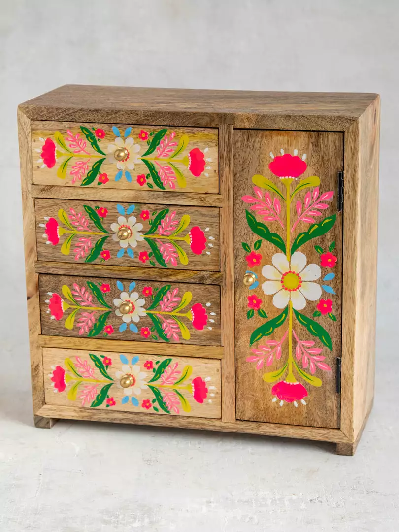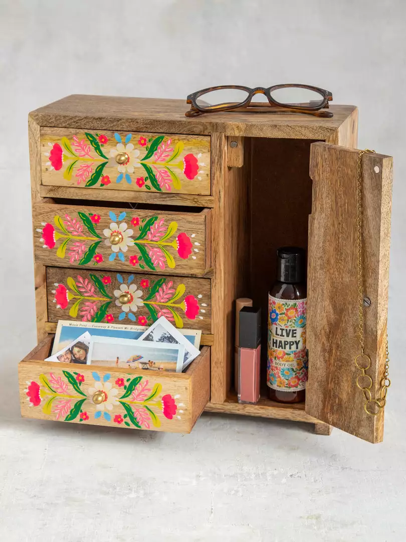 The Aria Dresser Cabinet is the cutest mini dresser to put on your big one! It features a natural wood finish with hand-painted florals and doors & drawers for storing all your treasures and fun little things!