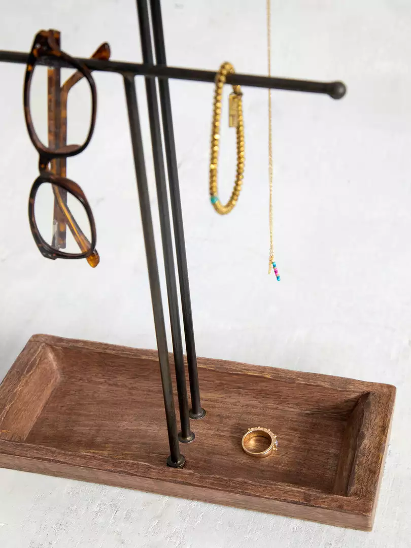Our jewelry is too pretty to not show off! Hang your necklaces, bracelets & rings on this tabletop Wooden Jewelry Stand for everyone to see! It features a mango wood tray and 3 metal holders for displaying your accessories… it makes the perfect piece for your nightstand, dresser or vanity!