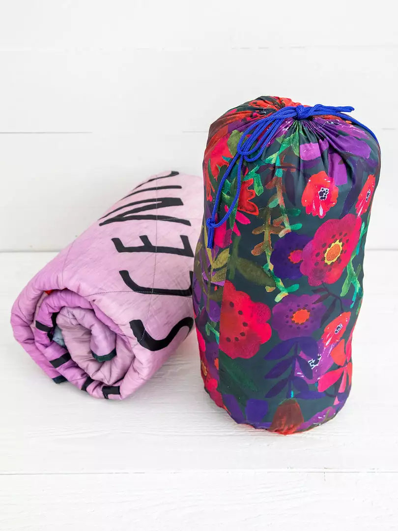 The Camp Quilt is so cool and we’re absolutely loving it! It’s washable, lightweight & easy to pack! It’s wind & water resistant, making it perfect for camping and beach nights… but can also be used indoors for sleepovers or even to keep in your car for when you need it! It’s like a sleeping bag without the zipper! It features corner loops to stake it to the ground and a cape clip so you can wear it and be hands-free! While our camp blankets are not temperature rated, they should keep you plenty warm. Need something warmer? Layer with 2 blankets!