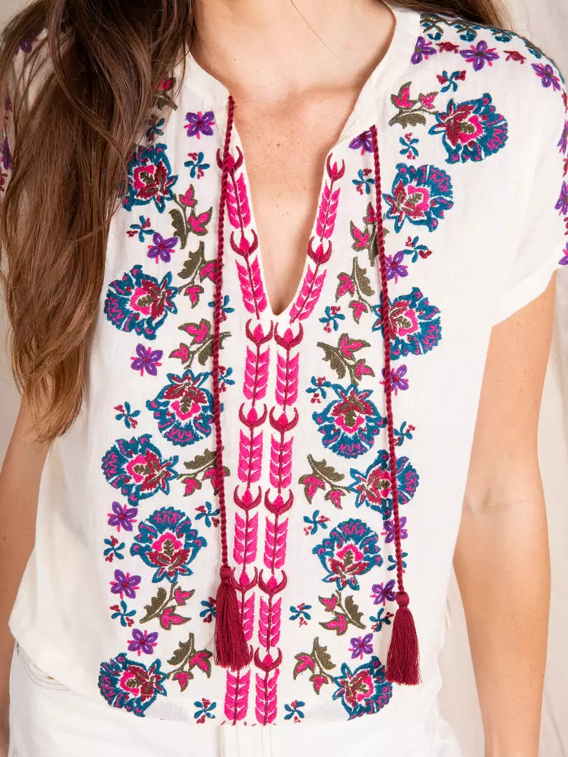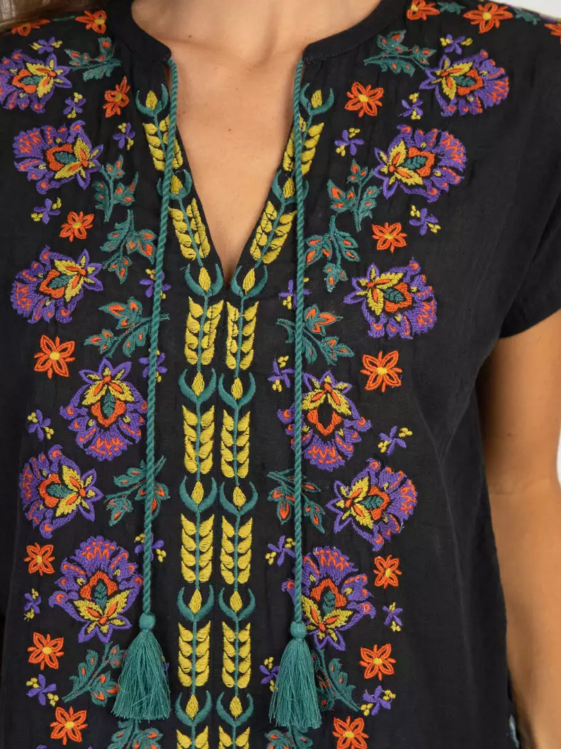 Cool. Cute. Carefree. Meet our cropped, Embroidered Tassel Top! This soft cotton top is embroidered in bright and beautiful colors. Matching tassels show off the v-neck and complete the bohemian look. Gorgeous embroidery goes all the way down both short sleeves with eye-catching detail. Wear it with jeans, shorts, or one of our daisy skorts! You can even throw on a jean jacket for a chilly night. Your style will stand out wherever you go.. this top can make an appearance anywhere!
