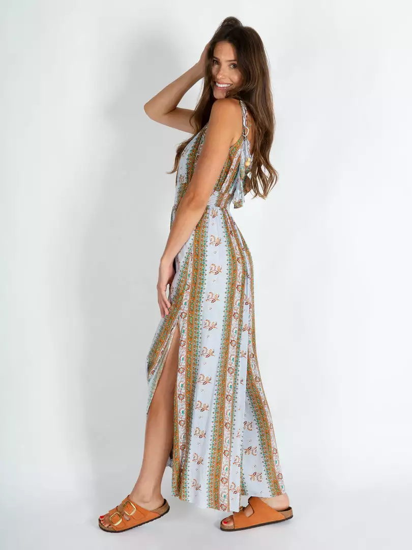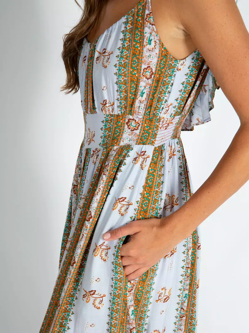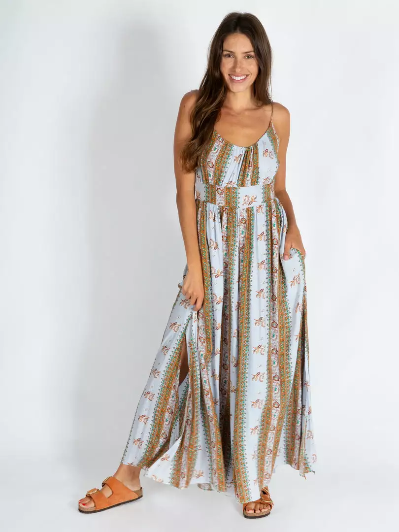 This might be our cutest jumpsuit yet! The Golden Eye Jumpsuit features so many fun things… like adjustable tie straps with wood beads, smocking in the back, side slits on the pant legs, a deep scoop back with ruffle details (that is so flattering on), and pockets! The wide leg silhouette makes it so flowy and fun to wear, this jumpsuit really has it all! The pattern placement will vary, so each jumpsuit is one-of-a-kind!