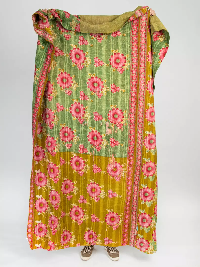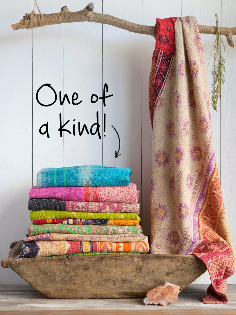 Our one-of-a-kind Kantha India Blankets add a super cool global feel to any room! Handmade from colorful vintage cotton saris, each blanket has a unique color scheme, pattern and texture and are even reversible! Great as throw blankets, rugs, tablecloths or to cozy up with on the couch with a good book and cup of coffee!