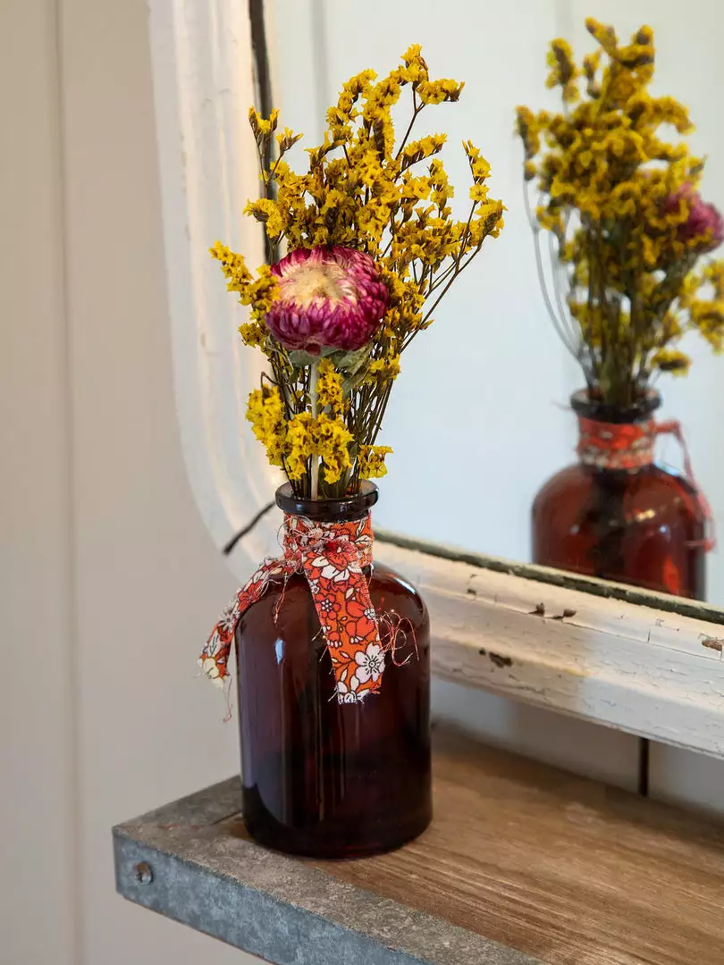 We love placing these little bottles of dried flowers tucked around our living space in any nook, nightstand or shelf. Each little arrangement is made from real preserved flowers placed in an amber glass bottle and tied with a cute raw edge printed fabric. They’re sold individually, but look so cute in clusters or in different rooms… so we always get at least one of each! They also make a sweet little gift for someone you love!