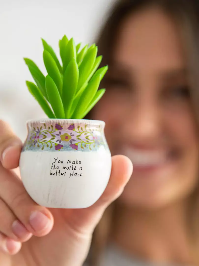 This little succulent is the CUTEST thing ever! Tiny faux succulents and heartfelt sentiments bring warmth and life into any space, like your desk, a window or on a shelf! They seriously make the perfect gift! Succulent and container combinations are sold as is.