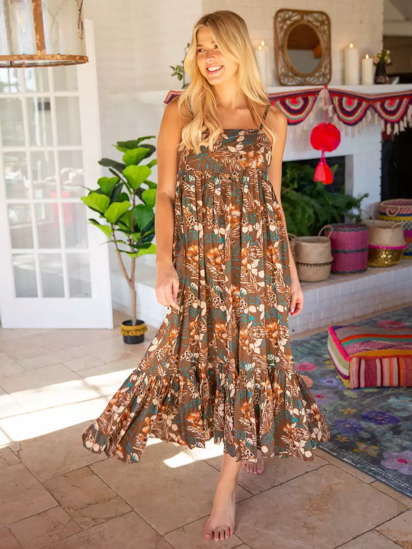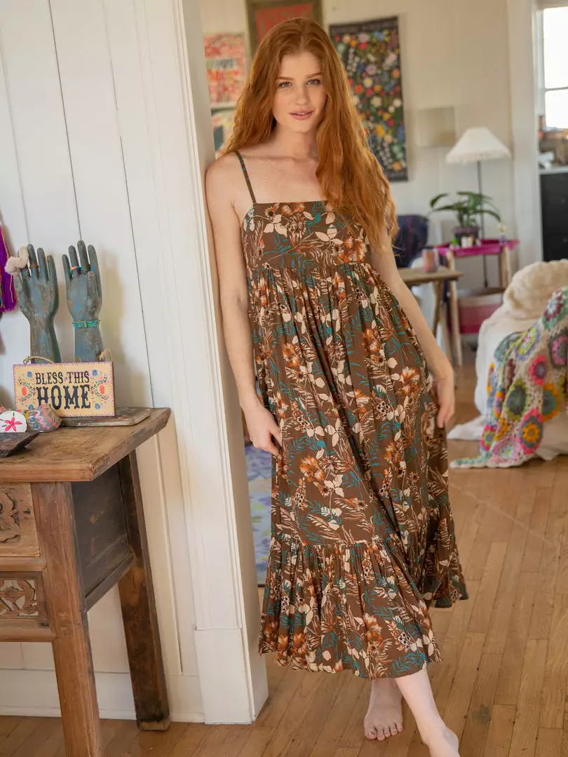 The Nina is a playful midi dress that features adjustable straps, a straight-across neckline and a ruffle tier at the bottom… making it flowy & fun to wear! The print is so pretty, bohemian and perfect for any occasion!