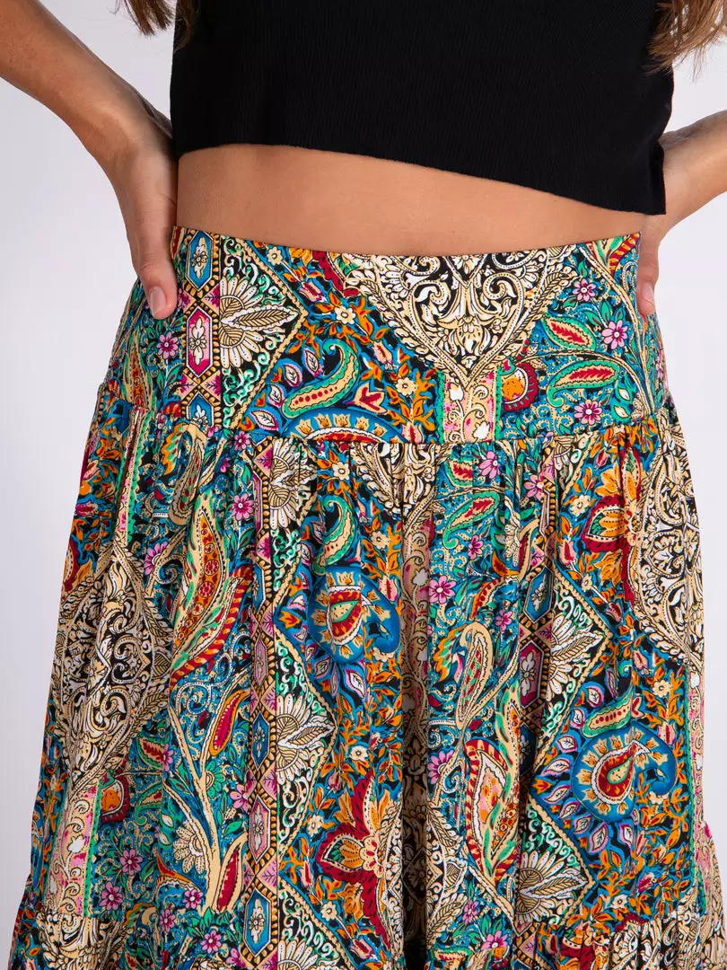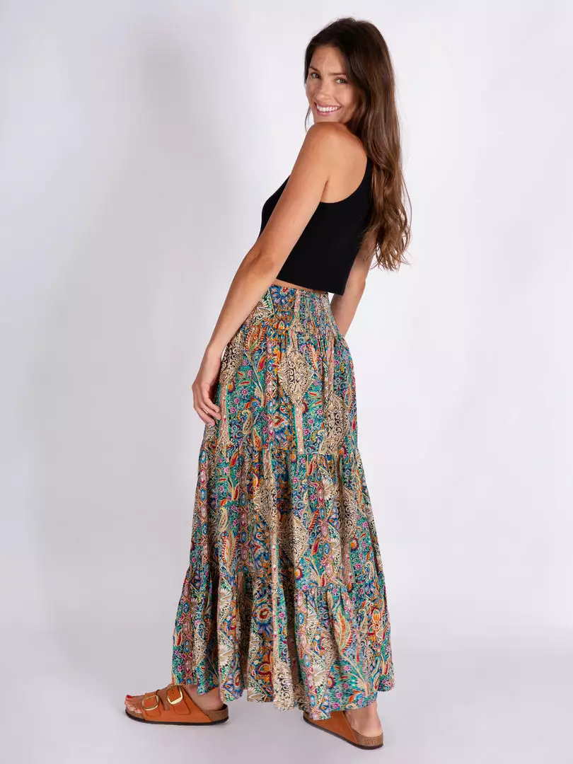 The Hanna Maxi Skirt is one of our most loved skirts! The bohemian mixed prints, billowy tiers and wide waistband with smocked elastic in the back makes it incredibly flattering and effortless. It’s such a pretty skirt that you can’t help but feel beautiful in it!